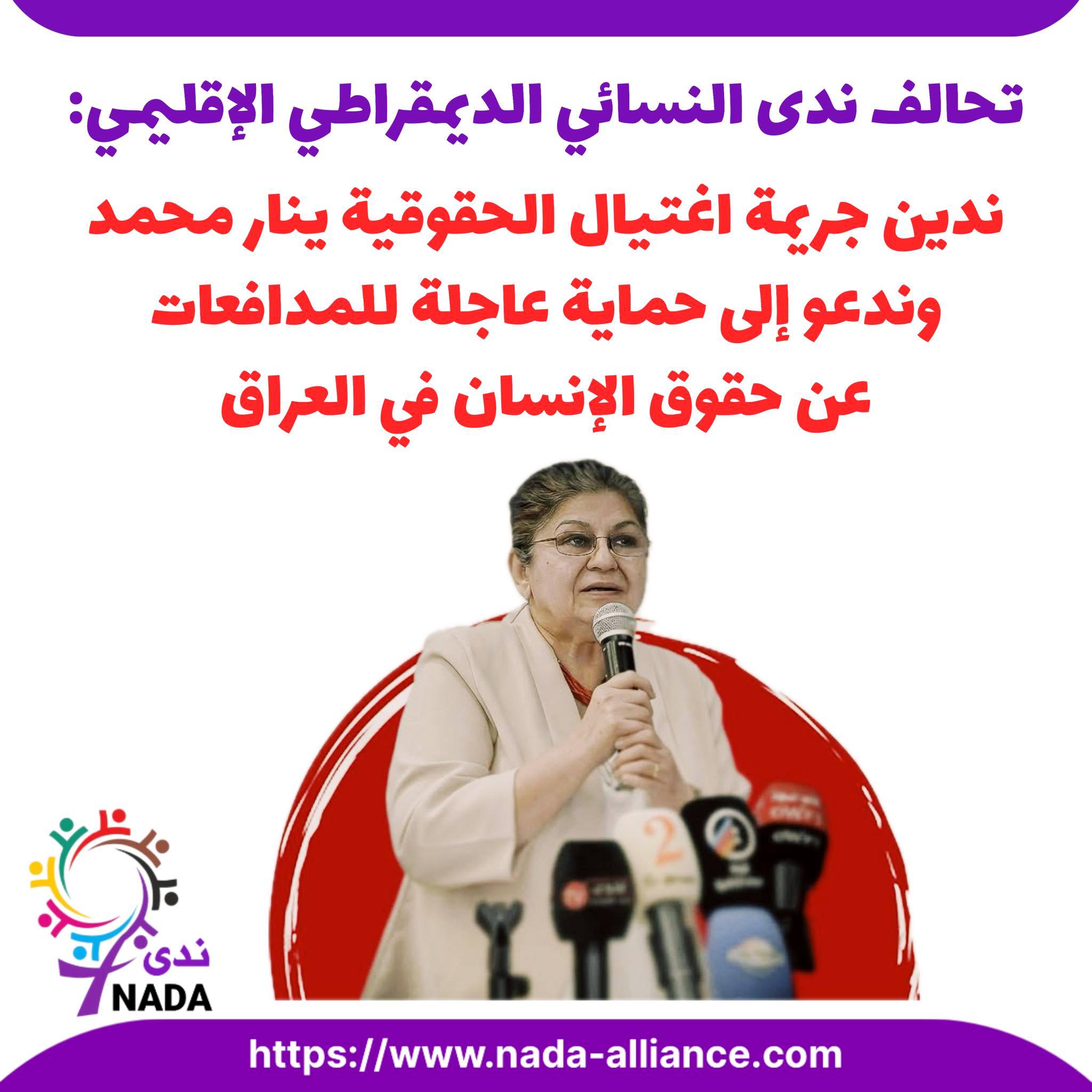يعرب تحالف ندى (التحالف النسائي الديمقراطي الاقليمي في الشرق الاوسط وشمال افريقيا) عن بالغ صدمته وحزنه إزاء جريمة الاغتيال الآثمة التي استهدفت الناشطة النسوية والحقوقية ينار محمد، رئيسة منظمة حرية المرأة في العراق، والتي أودت بحياتها صباح يوم الاثنين الموافق 2 آذار 2026 في العاصمة بغداد.