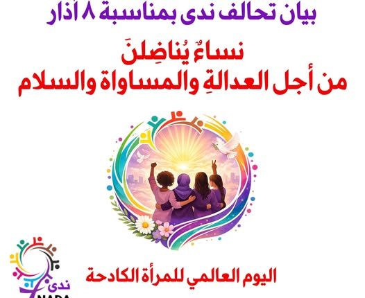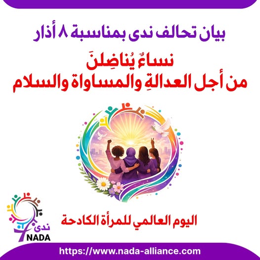 في الثامن من آذار، اليوم العالمي للمرأة، نرفع في تحالف ندى صوتنا عالياً، صوتاً يليق بكرامة النساء في منطقتنا، صوتاً يواجه الحروب والاحتلال، الإبادة والاستغلال، والرجعية التي تحاصر أحلام النساء وتقيّد خطواتهن، وتمنعهن من المضي في طريق الحرية والعدالة.