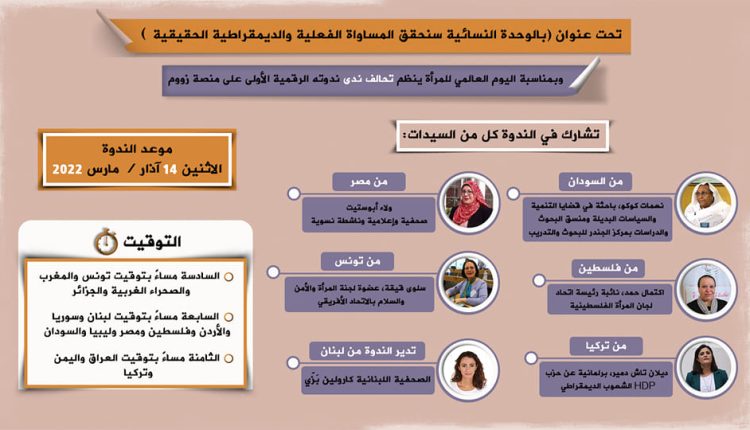 “بالوحدة النسائية سنحقق الثورة الديمقراطية”، تحت هذا الشعار نظم التحالف النسائي الديمقراطي الإقليمي في الشرق الأوسط وشمال أفريقيا أو كما يعرف باسم تحالف “ندى” ندوته الرقمية الأولى عبر تطبيق زووم، بمناسبة يوم المرأة العالمي.