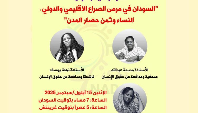 نظم تحالف ندى الإثنين 15سبتمبر2025، ندوة رقمية عبر الزوم، تحت عنوان” السودان في مرمى الصراع الإقليمي والدولي، النساء وثمن حصار المدن “، تحدثت عن التداعيات الإنسانية للحرب على النساء، علاوة على الحصار والتجويع كأدوات حرب من قبل أطراف الحرب